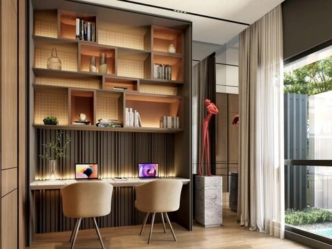 Area interiornya memiliki layout fungsional dengan kamar tidur luas yang terintegrasi dengan balkon, ruang keluarga yang terintegrasi dengan ruang makan dan smart home system.